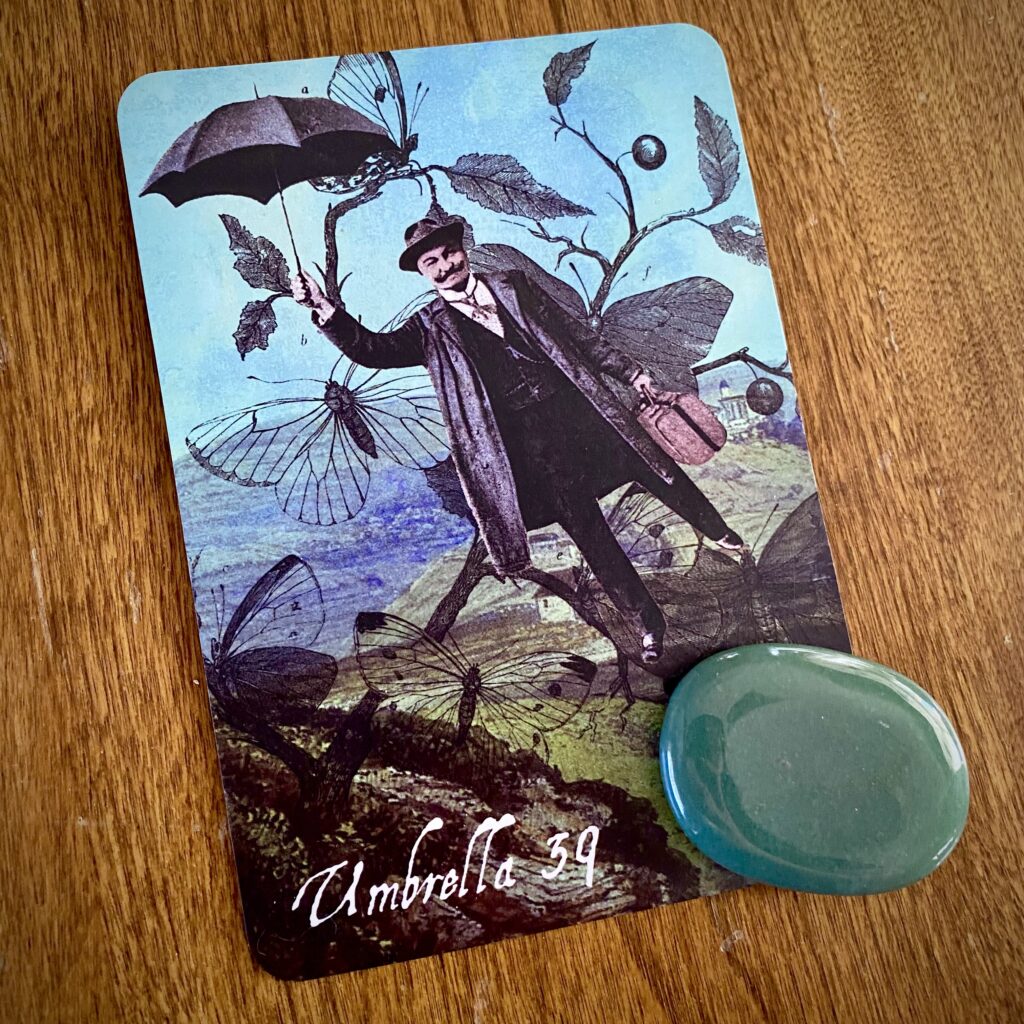 Umbrella- Optimism, clear direction, triumph, freedom. Negative attachments are cleared from you now. Surrendering heavy feelings and doubt. Effortless floating freedom.